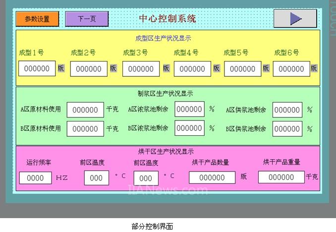 中心控制臺的作用是監(jiān)視整個工廠的生產(chǎn)狀況,同時協(xié)調(diào)四個工藝的進行。控制上,通過對PLC進行編程,可以對個個數(shù)據(jù)進行加減乘除運算,例如制漿系統(tǒng)里的原材料消耗,紙漿消耗,濃度換算,成型系統(tǒng)的數(shù)量統(tǒng)計,消耗紙漿重量統(tǒng)計等等。