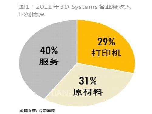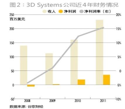3D Systems 向客戶提供“一站式”全套增值解決方案,包括硬件、軟件、材料、工藝、教育培訓(xùn)和應(yīng)用支持。它不僅提供打印機(jī),還出售打印機(jī)配套的原材料、相關(guān)設(shè)計軟件,并為客戶提供培訓(xùn),其解決方案涉及模具、醫(yī)療、教育、珠寶、建筑等行業(yè)。近年來,服務(wù)在公司收入中所占比例越來越高,2011年公司服務(wù)收入已達(dá)9312萬美元,占比由2007年的23.2%升至40%(圖1)。在服務(wù)、原材料和打印機(jī)三塊業(yè)務(wù)的整體拉動下,公司2011年收入同比增長44%至2.3億美元,凈利潤更是飆升81%至3542萬美元(圖2)。