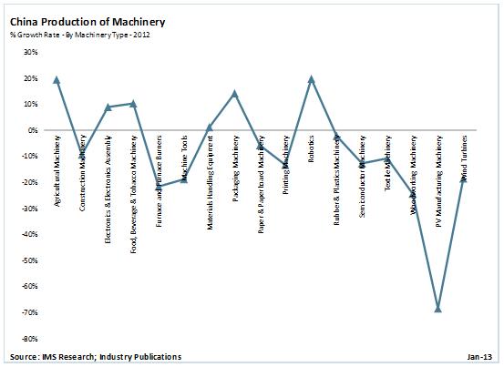 根據IMS Research最新研究報告,建筑工程機械,工業(yè)爐,機床,起重機,造紙設備,印刷機械,橡膠與塑料機械,半導體設備,紡織機械,木工機械,光伏生產設備,風機,F(xiàn)PD生產設備,冶金設備等眾多行業(yè),受到產能過剩、國內宏觀經濟調控和出口市場低迷等因素影響,都在2012年呈現(xiàn)了嚴重的負增長。
