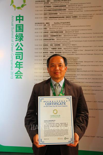 臺達集團榮獲2013中國綠公司百強民企10強,臺達中國區(qū)執(zhí)行副總裁廖慶龍先生出席年會領(lǐng)獎