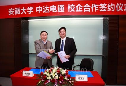 圖:中達(dá)電通董事總經(jīng)理游文人博士與安徽大學(xué)副校長杜先能先生簽署合作協(xié)議