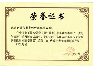 同期,2013年度“十大電氣創(chuàng)新企業(yè)及十大電氣創(chuàng)新產(chǎn)品”發(fā)布活動(dòng),向行業(yè)公布了包括“十大電氣創(chuàng)新企業(yè)”、“十大電氣創(chuàng)新產(chǎn)品”和“十大變頻器創(chuàng)新產(chǎn)品”的研究碩果。 合康變頻“高壓大功率同步矢量控制帶能量回饋?zhàn)冾l器”被評為“2013年度十大變頻器創(chuàng)新產(chǎn)品”。