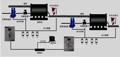 由于采用西門子標(biāo)準(zhǔn)變頻器使控制的過程實(shí)現(xiàn)穩(wěn)態(tài)的效果很好,采用前饋控制使系統(tǒng)快速有效地減弱外來擾動(dòng)(物料流量變化、返礦變化等)的影響,通過設(shè)定值跟蹤實(shí)現(xiàn)手自動(dòng)無擾動(dòng)切換,在配水控制器(西門子300PLC)的配合下,混和加水完全實(shí)現(xiàn)了自動(dòng)控制。
