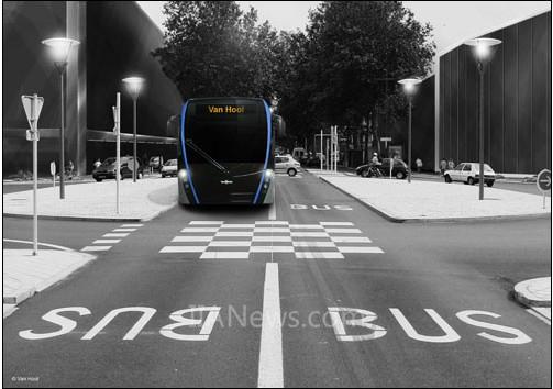專用車道上的創(chuàng)新公交車輛——柴油混合動(dòng)力公共汽車預(yù)計(jì)于2013年底投入使用。(版權(quán)所有:Van Hool)