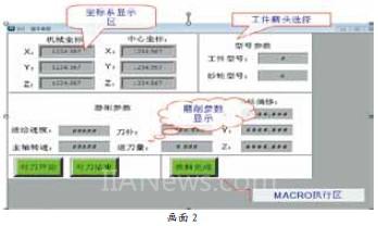 ■ 主要的是MACRO執(zhí)行區(qū)部分。在畫面中可以看到對刀開始 對刀結(jié)束和換料完成3個按鍵。( 此三個 按鍵的功能是一鍵調(diào)用MACRO 功能。例如換料完成部分,如果客戶按動此按鍵,會將需要的加工程序 調(diào)出,按動循環(huán)啟動即可加工。)