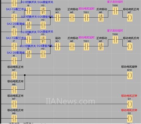 圖3為進(jìn)給電機(jī)運(yùn)動(dòng)控制部分的梯形圖程序段。進(jìn)給電機(jī)的運(yùn)行受到進(jìn)給軸選擇、機(jī)械拉桿結(jié)合位置、液壓信號、運(yùn)行延時(shí)、正方向選擇等多個(gè)條件的制約。以滑座正向運(yùn)行為例:首先需要將手持盒旋鈕SA2分配至滑座(I7為斷,I8為通),然后將機(jī)械拉桿分配至滑座結(jié)合位置(I9為斷),待到滑座液壓信號觸發(fā)(I10為通)和電機(jī)運(yùn)行延時(shí)觸發(fā)(T001為通,T008為通)時(shí),按下正向運(yùn)行按鈕(此時(shí)應(yīng)當(dāng)M1為通,M5為通,M6為斷),則此時(shí)滑座進(jìn)行正向運(yùn)行(即M7通,M9斷,Q1通,Q2斷)。