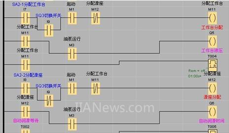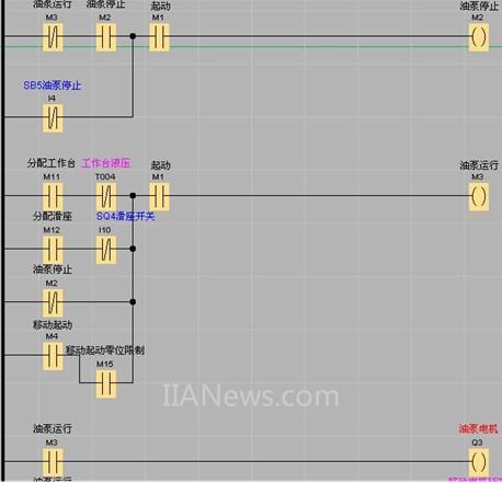圖5為油泵運(yùn)行控制的梯形圖程序段。油泵的控制受到運(yùn)動(dòng)分配、液壓信號等多重條件的影響,其核心功能是保證機(jī)床在任何動(dòng)作狀態(tài)下,都可以實(shí)現(xiàn)油泵的自動(dòng)啟動(dòng)運(yùn)行。