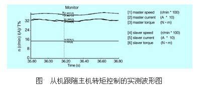 下圖為兩臺(tái)電機(jī)通過(guò)同一個(gè)減速機(jī)同軸聯(lián)結(jié)(剛性連接)的主從波形圖。采用abb傳動(dòng)調(diào)試軟件drivewindow監(jiān)測(cè)主機(jī)和從機(jī)在工作過(guò)程中的轉(zhuǎn)速([1]代表主機(jī),[4]代表從機(jī))、電流([2]代表主機(jī),[5]代表從機(jī))和輸出轉(zhuǎn)矩([3]代表主機(jī),[6]代表從機(jī))的波形。圖中的數(shù)值為相應(yīng)的實(shí)測(cè)值。主機(jī)給定轉(zhuǎn)速為1480r/min。由圖可見,從機(jī)跟隨主機(jī)的轉(zhuǎn)矩輸出,兩電機(jī)分別輸出額定轉(zhuǎn)矩的約37.4%左右,負(fù)載分配基本平衡,兩電機(jī)實(shí)際輸出電流約為320a左右。由于主從機(jī)為剛性連接,主從機(jī)轉(zhuǎn)速由機(jī)械結(jié)構(gòu)保持同步,實(shí)際轉(zhuǎn)速為1480r/min左右。