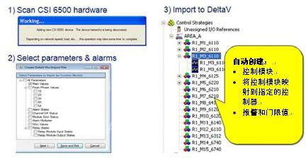 渦輪機(jī)械與 DeltaV 過程自動(dòng)化系統(tǒng)的連接只需 3個(gè)簡單步驟在10 分鐘內(nèi)即可完成。AMS Machinery Manager 和CSI 6500 Machinery Health Monitor能夠?qū)①Y產(chǎn)參數(shù)掃描、選擇并導(dǎo)入DeltaV 系統(tǒng):