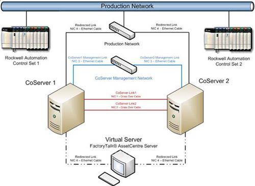 兩塊母板完全同步,看上去就像一塊母板,因此當一塊母板退出時,仍能保持軟件的運行能力。創(chuàng)建協(xié)服務器要進行一系列的配置,這些內容在馬拉松技術everRunFT?的配置和安裝指南中給出。比如,使用合適的網絡架構,用戶可以把一臺協(xié)服務器放在一個工廠而把另一臺協(xié)服務器放在地理位置完全不同的另一個工廠。這種配置不僅能夠提供FactoryTalk? AssetCentre系統(tǒng)在一個工廠的容錯,而且能保證在整個工廠發(fā)生事故停機時的切換。圖2繪出了協(xié)服務器、虛擬服務器和一個典型工廠網絡之間關系更詳細的結構。