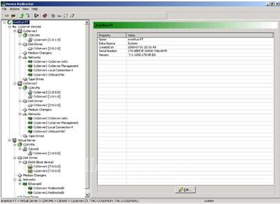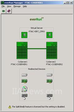 上圖表明了一個全功能的everRunFT?環(huán)境,由兩臺協(xié)服務器和一臺虛擬服務器組成。在圖的上部,注意虛擬服務器狀態(tài)窗提供了虛擬服務器的名字,這個例子中是FTAC-Virt_CPR9,還有每臺協(xié)服務器的虛擬服務器狀態(tài)。圖還顯示了每臺協(xié)服務器的狀態(tài)和計算機名字以及協(xié)服務器之間的協(xié)服務器鏈接狀態(tài)。每臺設備對虛擬服務器的重定位狀態(tài) 會給出報告。圖3表明來自每臺協(xié)服務器的系統(tǒng)磁盤、網絡控制器、鍵盤和鼠標對于虛擬服務器的重定位 。有臺CD-ROM驅動器來自協(xié)服務器 1, 不是來自協(xié)服務器2。最后,注意有一條關于SplitSite?服務的報警信息。關于SplitSite?服務的詳情,請參閱馬拉松技術公司的 everRunFT?獲得結果指南。
