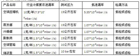 下表R134a制冷劑對(duì)應(yīng)的產(chǎn)品部件的泄漏檢測(cè)要求
