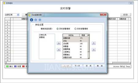 第1步為表格設(shè)置,包括模板類型設(shè)置和顯示字段設(shè)置。模板類型為2種:實時報警、歷史報警。顯示字段中包括可以顯示的所有內(nèi)容,用戶可以根據(jù)需要選擇,并可以設(shè)置顯示的寬度。如下圖所示: