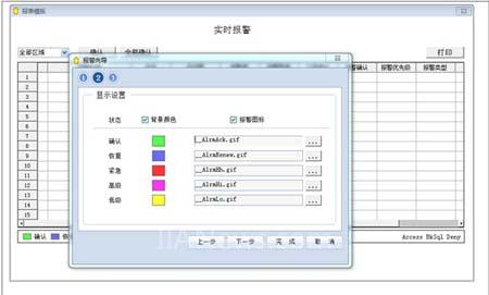 第2步為顯示設(shè)置,可以設(shè)置每一條報警記錄的背景顏色和報警圖標。背景顏色只顯示在“報警確認”和“報警優(yōu)先級”2個字段中。如果選擇顯示報警圖標,則圖標顯示在每條記錄的第1列,否則不顯示圖標。如下圖所示: