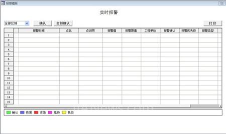 實時報警包括:區(qū)域選擇、報警確認、打印、報警顯示、背景顏色圖例和查詢異常顯示。