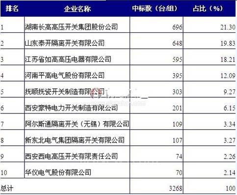 截至2013年11月14日,國家電網(wǎng)累計(jì)發(fā)布六批公司變電項(xiàng)目貨物集中招標(biāo)——隔離開關(guān)的招標(biāo)文件,累計(jì)招標(biāo)隔離開關(guān)24227.5組。選取其中第五批次的隔離開關(guān)中標(biāo)企業(yè)進(jìn)行分析,發(fā)現(xiàn)國內(nèi)本土企業(yè)湖南長高高壓開關(guān)集團(tuán)股份公司、山東泰開隔離開關(guān)有限公司、江蘇省如高高壓電器有限公司和河南平高電氣股份有限公司四家公司的中標(biāo)份額高達(dá)71.42%,中標(biāo)數(shù)排名前十的企業(yè)中,僅有一家外資企業(yè)——阿爾斯通隔離開關(guān)(無錫)有限公司,位列第七。