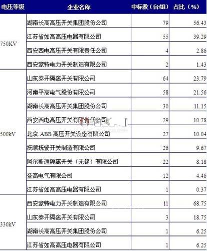 從330KV及以上電壓等級(jí)來看,湖南長高高壓開關(guān)集團(tuán)股份公司在750KV電壓等級(jí)中標(biāo)企業(yè)中排名第一,中標(biāo)數(shù)為79臺(tái)/組,遠(yuǎn)高于其它企業(yè),在高電壓等級(jí)占據(jù)絕對優(yōu)勢地位;在500KV電壓等級(jí)的中標(biāo)企業(yè)中,山東泰開隔離開關(guān)有限公司和河南平高電氣股份有限公司高居榜首,中標(biāo)數(shù)分別為64臺(tái)/組和58臺(tái)/組,且有兩家外資企業(yè)中標(biāo),分別為北京ABB高壓開關(guān)設(shè)備有限公司和阿爾斯通隔離開關(guān)(無錫)有限公司;西安豪特電力開關(guān)制造有限公司在330kV電壓等級(jí)中位居首位。