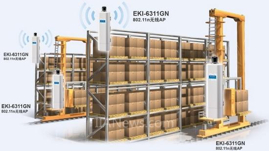 研華推出的EKI-6311GN是一款性能卓越的無線AP/CPE產(chǎn)品,符合IEEE 802.11 b/g/n無線通訊標準,可以很好地滿足智能無線通訊倉儲的需求。為解決信號弱的問題,我們將設備分別安裝在貨架兩端,使用漏波電纜提供無線覆蓋及天線橋接;此外,堆垛機中的EKI-6311GN可作為客戶端模式(CPE)。由于EKI-6311GN可以輕松實現(xiàn)整個倉庫無線網(wǎng)絡覆蓋,并且也可作為網(wǎng)橋即時連接有線設備到廠區(qū)中心最高網(wǎng)絡,中控室可以無縫連接至倉庫設備,而堆垛機中安裝的EKI-6311GN亦可根據(jù)信號強度自動檢測并連接到最佳AP以確??煽客ㄓ?。若PLC通訊接口為串口可通過EKI-1351實現(xiàn)快速漫游通訊。