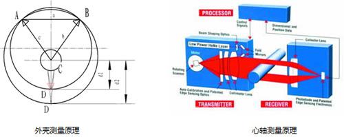 本方案根據(jù)外殼和心軸尺寸的差異,將上羅拉軸承的測試分解在兩個(gè)設(shè)子備上實(shí)現(xiàn)。外殼部分主要運(yùn)用了三點(diǎn)測徑法原理,來實(shí)現(xiàn)內(nèi)徑尺寸和形位公差的測試;心軸部分主要應(yīng)用了陰影投射原理測試,來實(shí)現(xiàn)尺寸和形位公差的測試。