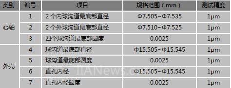 (2)尺寸測量:測量心軸、外殼滾珠溝道、直孔位置直徑、圓度;