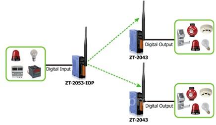 ZT-2053-IOP硬件功能如同ZT-2053,提供了14通道的數(shù)字量輸入可用于干或濕節(jié)點(diǎn),干節(jié)點(diǎn)有效距離可達(dá)500公尺,并且與ZT-2043進(jìn)行綁定;意即當(dāng)ZT-2053-IOP的數(shù)字量輸入通道發(fā)生變化時(shí),遠(yuǎn)程所有ZT-2043的數(shù)字量輸出通道立即會(huì)作相同的同步更新。