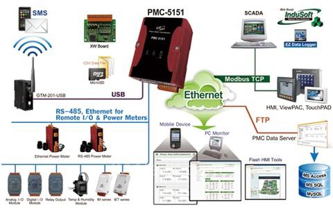 使用PMC-5151構建電力監(jiān)控系統(tǒng)是彈性且容易的,初期小規(guī)模階段,客戶可以僅使用智能電測模塊與電測模塊集中器,輕松架設簡單的電力采集監(jiān)控系統(tǒng);規(guī)模擴充后,通過后端軟件(如 Indusoft) 的導入,可以采用積木推迭的架構,逐一整合擴充,系統(tǒng)彈性度高,可分階段實施,適合不同的需求。