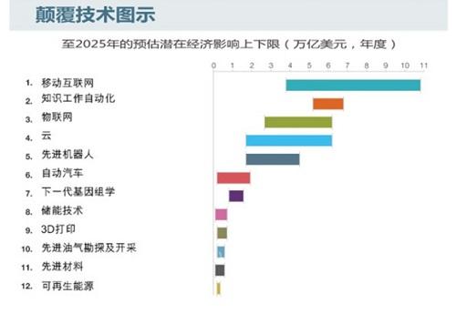 如上表所示,麥肯錫認(rèn)為,未來(lái) 10 多年最具經(jīng)濟(jì)影響性的技術(shù)應(yīng)該是那些已經(jīng)取得良好進(jìn)展的技術(shù)—如已經(jīng)在發(fā)達(dá)國(guó)家普及并在新興國(guó)家蓬勃發(fā)展的移動(dòng)互聯(lián)網(wǎng);知識(shí)工作的自動(dòng)化,比方說(shuō)用計(jì)算機(jī)語(yǔ)音來(lái)處理大部分的客戶電話;物聯(lián)網(wǎng),比方說(shuō)將傳感器嵌入物理實(shí)體中用來(lái)監(jiān)控產(chǎn)品在工廠的流動(dòng);以及云計(jì)算。按照麥肯錫的估算,到 2025 年,這些技術(shù)每一個(gè)對(duì)全球經(jīng)濟(jì)的價(jià)值貢獻(xiàn)均超過(guò) 1 萬(wàn)億美元(即便是預(yù)測(cè)的下限)。