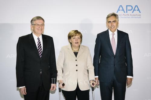 德國總理默克爾與新任德國經(jīng)濟(jì)亞太委員會主席林哈德,前任主席羅旭德出席就職儀式
