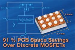 器件只占2.3mm2的面積,比分立MOSFET節(jié)省91%;在3.3V下的導(dǎo)通電阻低至6.5mΩ,靜態(tài)電流為0.015nA
