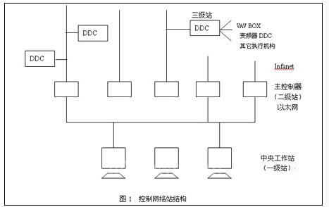 在該大樓中,除冷凍站外,所有建筑用電氣設備均由中央控制站按日程表排列進行控制(一種鐘控方式)。全自動運行并允許局部人工干預。其通訊控制系統(tǒng)為二級網(wǎng)絡加DDC控制,由美國Andover產(chǎn)品構成,如圖1所示。