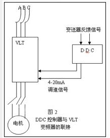 在圖1中,中央控制站由三臺一級站,五臺二級站構成。DDC控制器作為三級站分布于各個現(xiàn)場(房間及其他受控點)。一級站與二級站之間由以太網(wǎng)(ETHERNET)連接:二級站與三級站之間的連接由Andover公司的Infanet網(wǎng)構成,雙線,高速(12Mb)的Infanet使龐大的控制系統(tǒng)運行靈活自如,井然有序,三級站則以DDC方式對現(xiàn)場設備實施控制。圖2所示為DDC控制器與VLT變頻調(diào)速ABC器的連接示意圖。由圖可見,DDC 根據(jù)總線設定,經(jīng)對管網(wǎng)風壓等參數(shù)進行測試后,對變頻器實施控制,從而改變風機的流量。各種傳感器的變送器反饋信號安裝,熱交換的方式,氣流控制及氣流運動方向