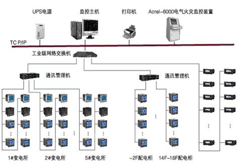 c)管理測(cè)控層是針對(duì)監(jiān)控網(wǎng)絡(luò)的管理人員,該層直接面向用戶(hù)。該層也是系統(tǒng)的最上層部分,主要是由電氣火災(zāi)監(jiān)控系統(tǒng)軟件和必要的硬件設(shè)備如計(jì)算機(jī)、打印機(jī)、UPS等。其中軟件部分具有良好的人機(jī)交互界面,通過(guò)數(shù)據(jù)傳輸協(xié)議讀取前置機(jī)采集的現(xiàn)場(chǎng)各類(lèi)數(shù)據(jù)信息,自動(dòng)經(jīng)過(guò)計(jì)算處理,以圖形、數(shù)顯、聲音等方式反映現(xiàn)場(chǎng)的運(yùn)行狀況,并可接受管理人員的操作命令,實(shí)時(shí)發(fā)送并檢測(cè)操作的執(zhí)行狀況,以保證供用電單位的正常工作。