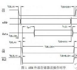 在本設(shè)計(jì)中,用到ARM外部總線的信號(hào)有:[310].ADDR[230].BLS等。CS為片選信號(hào),WE為寫使能信號(hào),OE 為讀使能信號(hào),DATA為數(shù)據(jù)總線,ADDR地址總線,BLS為字節(jié)組選擇信號(hào)。ARM的外部總線讀操作時(shí)序圖,分別如圖1所示。