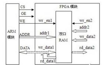 FPGA 和ARM之間的外部并行總線連接框圖,如圖2所示。由于FPGA內(nèi)部的SRAM存儲(chǔ)單元為32位,不需要進(jìn)行字節(jié)組的選擇,因此BLS信號(hào)可以不連接。為了便于實(shí)現(xiàn)ARM和FPGA之間數(shù)據(jù)的快速傳輸,F(xiàn)PGA內(nèi)部的SRAM既要與ARM處理器進(jìn)行讀寫處理,還要跟FPGA內(nèi)部的其他邏輯模塊進(jìn)行數(shù)據(jù)交換,因此SRAM采用雙口RAM來(lái)實(shí)現(xiàn)。