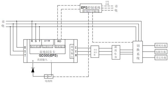 逆變部分為我司EPS專用變頻器,輸出電壓根據(jù)需要設(shè)定,在市電有正常時,逆變輸出保持同步空載輸出,并向系統(tǒng)控制器輸出同步信號,市電提供空載輸出用電,市電掉電時,負載切換到后備電源,電池組通過直流母線提供負載用電。