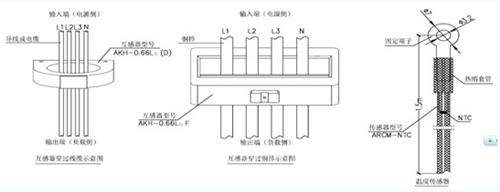 3)剩余電流和溫度傳感器穿線示意圖。剩余電流互感器的額定電流等級(jí),應(yīng)大于或等于配電回路保護(hù)電器的整定電流值,實(shí)際應(yīng)用中應(yīng)確保所有線纜或銅排穿過(guò)互感器;.溫度傳感器為一熱敏電阻NTC,它提供-10℃-120℃的溫度監(jiān)控基準(zhǔn),可以用來(lái)監(jiān)測(cè)線纜或配電箱內(nèi)的溫度,提供溫度保護(hù),如圖4所示