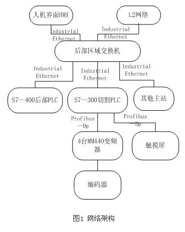 濟鋼120噸轉(zhuǎn)爐1#連鑄機1#切割車系統(tǒng)主要有大車行走部分,割槍切割部分,車體介質(zhì),測量部分等組成。切割車主要作用是將鑄機澆注出的鋼坯根據(jù)設(shè)定定尺進行切割,濟鋼120噸轉(zhuǎn)爐連鑄機設(shè)計定尺為6m~9m;切割速度為0~600mm/min;大車行走距離為0~10m;整個系統(tǒng)通過s7-300進行控制,通過profibus總線實現(xiàn)對4臺m440變頻器控制,通過cp模塊接入后部plc交換機實現(xiàn)連網(wǎng)及計算機二級控制。具體網(wǎng)絡(luò)如圖1所示。