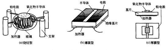 (c)為厚膜型器件,是將SnO:或ZnO等材料與3%-5%的硅凝膠混合制成厚膜膠,將其與裝有鉑電極的氧化物基片組合燒結(jié)制成。這種器件離散性小,機(jī)械強(qiáng)度高,適合大批量生產(chǎn),是一種有前途的器件。