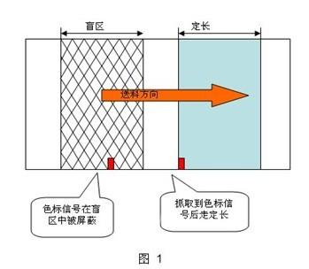 光控的過程如下(參考下圖1):當(dāng)伺服運行在盲區(qū)時,根據(jù)PLC設(shè)置的盲區(qū)拖料的速度運行,開始進行送料,在走的過程中,如果已送料的長度小于盲區(qū)長度的大小,此時,色標(biāo)信號被屏蔽,即使有色標(biāo)信號PLC也不理會;當(dāng)已送料長度大于盲區(qū)長度后,PLC捕捉此后出現(xiàn)的第1個色標(biāo),當(dāng)碰到色標(biāo)信號后,以碰到色標(biāo)的位置為起點,再走窗口的距離(如圖2所示),然后停止。如果,色標(biāo)信號一直不出現(xiàn),伺服就以一開始的速度走設(shè)定的送料長度。