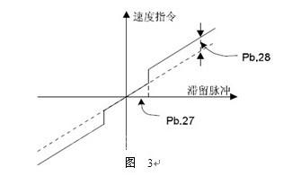 Pb.27(速度補償閥值)是用來設(shè)定位置模式下速度補償?shù)臏裘}沖閥值。在位置模式下,當(dāng)滯留脈沖的絕對值超過該功能碼的設(shè)定值時,可通過在速度指令上疊加一個速度補償量來減少位置到達(dá)的時間。示意圖如下: