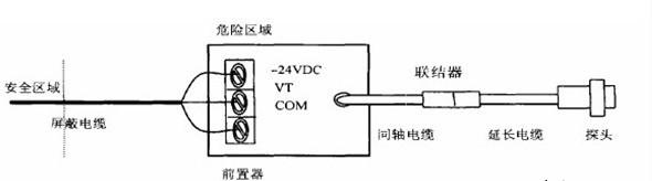 其中探頭是被精密地繞在圓形芯軸上的線圈 , 其頭部由聚苯撐硫化物組成 , 并用螺紋擰進(jìn)不銹鋼殼體內(nèi)[ 1 ] 。根據(jù)探頭的直徑分為 5 mm 、8 mm 兩種 , 延長電纜帶有內(nèi)裝電纜和同軸電纜聯(lián)結(jié)所組成系統(tǒng) , 要求從探頭端部到前置器距離 5m 或 9 m , 探頭與電纜的長度可以和相同類型的前置器任意配用 ; 前置器具有兩種功能 , 由振蕩器電路發(fā)生高頻信號(hào) , 由檢波器將變化的頻率信號(hào)調(diào)整為精確的可用信號(hào) 。為了實(shí)現(xiàn)這些功能 , 需要在它的 V T 端和 COM 端之間提供- 24VDC 電源 。前置器和 RDZW-2Na監(jiān)測系統(tǒng)的信號(hào)輸出和電源供給由一根三芯屏蔽電纜完成 , 前置器可以放在離監(jiān)測器 1000 英尺遠(yuǎn)的地方而不必增益。