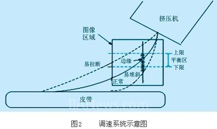 調(diào)速系統(tǒng)的主要目的:將擠出的棒材穩(wěn)定在一定的區(qū)域,圖2給出調(diào)速系統(tǒng)示意圖,也就是將圖像處理器檢測到的棒材邊緣點控制在平衡區(qū)內(nèi)。這樣棒材才可以正常擠出,不被拉斷、產(chǎn)生堆料。同時還可以保證擠出棒材的均勻度。