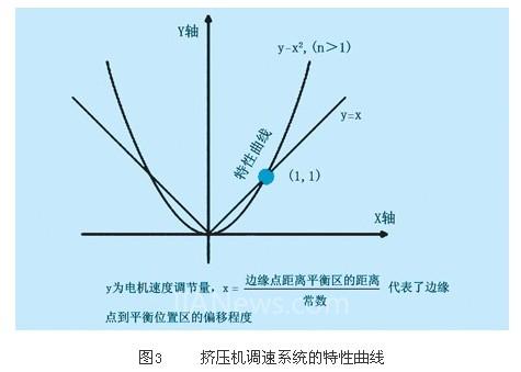 (1)首先,通過對擠壓機的現(xiàn)場調(diào)速試驗,我們總結出了它的模糊模型-拋物線模型。越接近理想位置速度調(diào)節(jié)量越少,越遠離理想位置速度調(diào)節(jié)量越大,而且速度調(diào)節(jié)量跟與理想位置的差距為乘冪關系,如圖3所示: