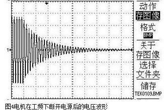 由于變頻器輸出的是PWM波,其相位不易觀察,測得在工頻狀態(tài)下的電壓波形進行進一步的分析。因為變頻器50Hz時的輸出電壓與工頻電壓作用在電機上基本時等效的,并不影響分析結(jié)果。圖4是電機在工頻電源下突然斷開電源后的電壓波形圖,由該圖可以看出,電壓波形沒有跳變,所以斷開瞬間感應電動勢與電源電壓是同相位的,其幅值也是基本相等的。隨著剩磁的慢慢消失,電壓幅值逐漸降低,同時伴隨著轉(zhuǎn)速的降低感應電動勢的頻率逐漸下降,其相位也逐漸與電源相位拉開。頻率越低,單位時間內(nèi)拉開的相位差也就越大。