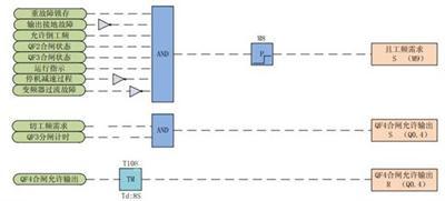 當條件都滿足時會在QF3分閘1秒后發(fā)出QF4合工頻允許信號,而不是直接合工頻,主要是因為切工頻還要考慮到鍋爐自身的一些條件,如果鍋爐本身負載比較低,要求風量并不大,突然切至工頻時負壓突然急劇上升會導致鍋爐熄滅,所以僅將允許和QF4信號發(fā)給DCS,DCS根據(jù)鍋爐運行情況,關(guān)小出口風門后發(fā)出QF4合閘指令,切至工頻,還可以根據(jù)情況投油,避免熄火。