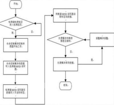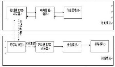 判斷模塊由判斷端RFID讀寫器、可讀寫標(biāo)簽、處理模塊和報警模塊構(gòu)成,處理模塊與判斷端RFID讀寫器電連接,處理模塊與報警模塊電連接。
