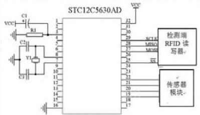 檢測模塊的部分電路原理圖如圖2所示,中央控制模塊采用單片機STC12C5630AD,單片機的P3.7端口與傳感器模塊電連接,用于控制傳感器模塊是否工作,單片機的第P1.0、P1.1和P1.2引腳與傳感器模塊電連接,用于接收傳感器模塊采集的信號。單片機SPI接口的4個引腳: MISO 、SCLK 、MOSI 和S 分別與檢測端RFID讀寫器的SPI接口電連接,用于接收檢測端RFID讀寫器讀取的可讀寫標(biāo)簽的UID,并可將傳感器模塊采集的數(shù)據(jù)及汽車車牌號發(fā)送給檢測端RFID讀寫器。