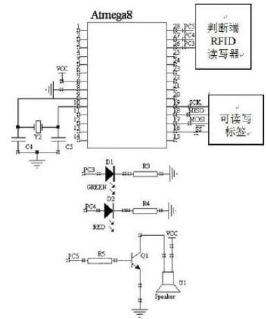 判斷模塊的部分電路原理圖如圖3所示,處理模塊采用單片機Atmega8,其SPI接口的4個引腳: MOSI 、SCK 、MISO 、MOSI 和S 分別與判斷端RFID讀寫器的SPI接口電連接,用于讀取判斷端RFID讀寫器中的數(shù)據(jù),該數(shù)據(jù)是判斷端RFID讀寫器讀取可讀寫標(biāo)簽存儲的數(shù)據(jù)。