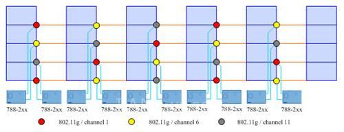 輪流使用IEEE802.11g無線信道1,6,11避免相同信道信號(hào)干擾;
