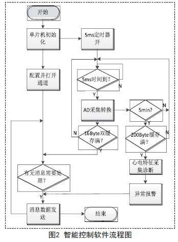 主要過程為在信號調(diào)理電路預(yù)處理心電模擬信號之后,超低功耗微處理器通過內(nèi)置的10位AD轉(zhuǎn)換模塊(采樣精度為3mV)對模擬數(shù)據(jù)進行采集和轉(zhuǎn)換,采樣周期為5ms,并將轉(zhuǎn)換后的數(shù)據(jù)取高8位后通過與異步串口(UART)交由藍(lán)牙模塊通過無線藍(lán)牙網(wǎng)絡(luò)發(fā)出。